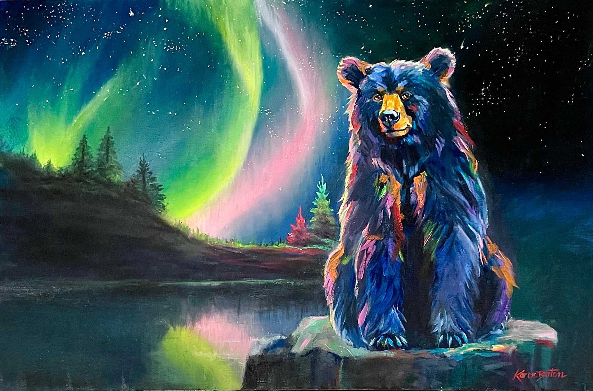 Immerse yourself in the magic of the northern lights with "Aurora Bear," a captivating original oil painting by Karen Barton. This stunning 24" x 36" artwork features a serene black bear sitting proudly on a rock, surrounded by the breathtaking colors of the aurora borealis. The swirling greens, pinks, and blues of the sky are reflected in the bear’s fur, creating a vibrant, otherworldly effect that captures the beauty and wonder of nature.