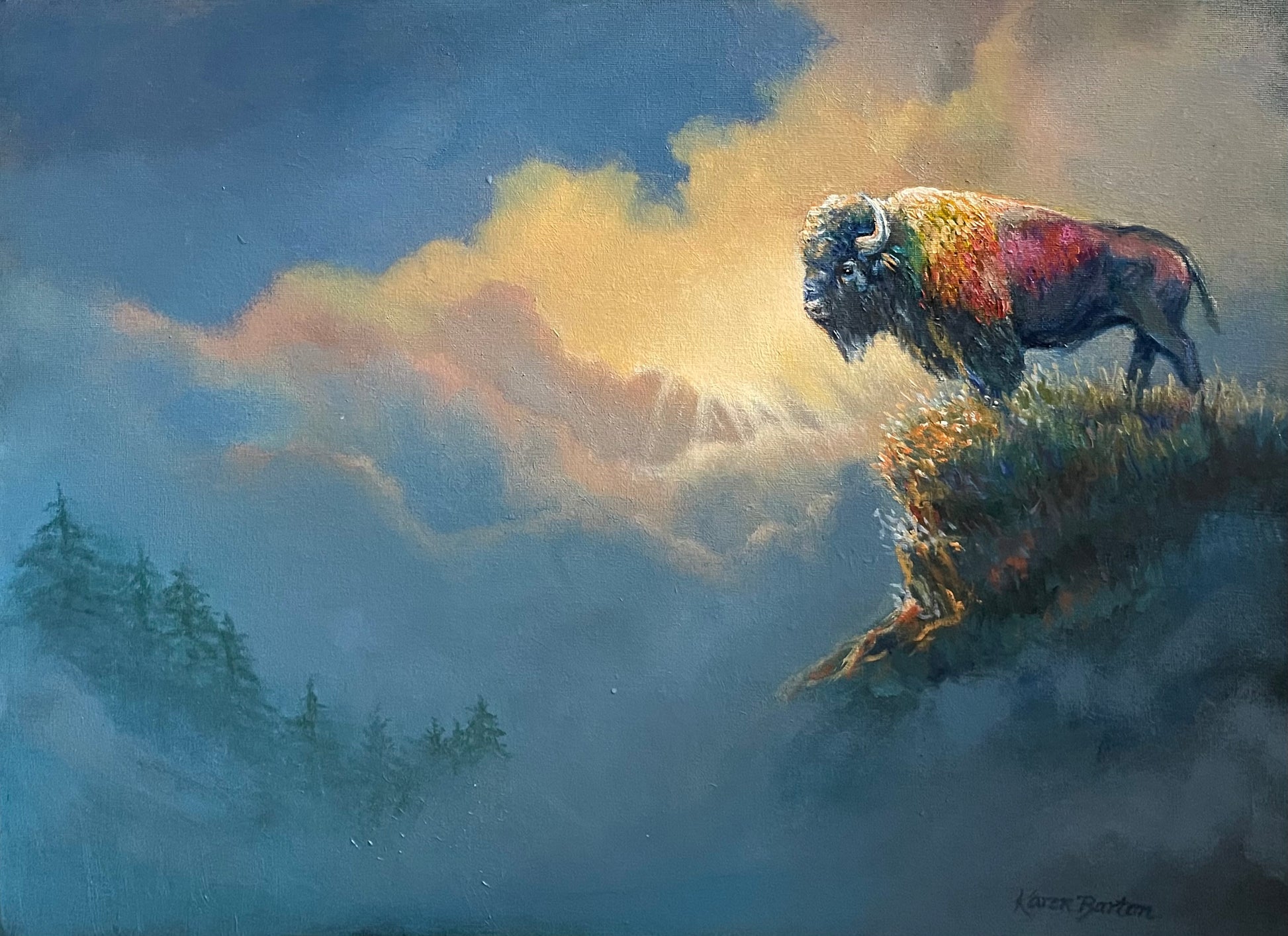 An American Bison stands on the edge of a cliff overlooking a vast valley filled with glowing clouds. Western wildlife is mixed with dark, dreamy atmospheric feelings. Framed in a black 24x18 wooden frame, this original buffalo oil painting glows. The colorful buffalo is true to the style of artist Karen Barton.