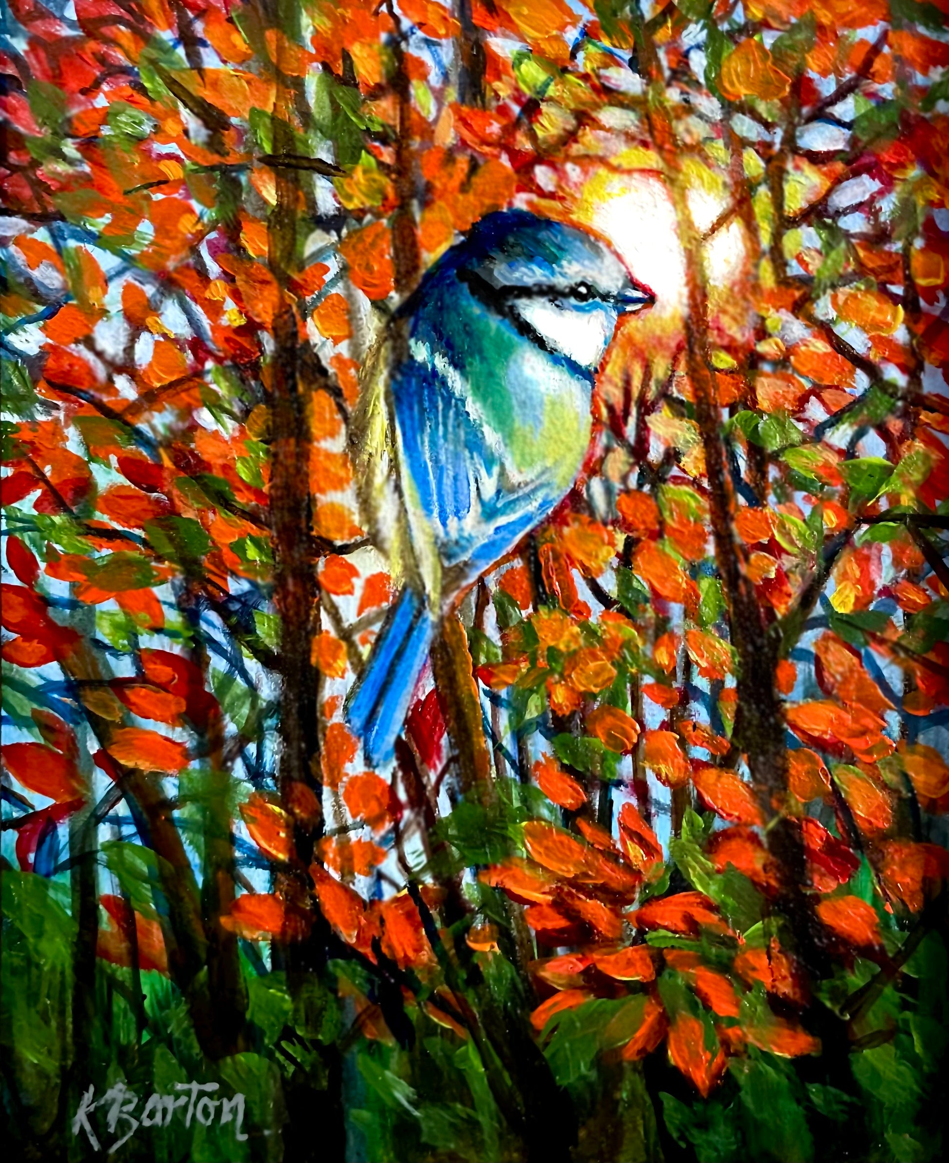 This high-quality 8x10 print of "Autumn Glow" brings bold fall color and delicate detail into your home. The original oil painting features a blue tit perched quietly among autumn branches, glowing in the warm light of the setting sun. Vivid brushwork and vibrant hues make this piece stand out while capturing a peaceful moment in the woods.